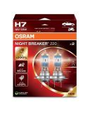 Novo Pack de 2 Lâmpadas Halógenas H7 Osram Night Breaker 220 (PX26d) para Veículos 12V com potência de 58W e 220% mais luz que uma Lâmpada Convencional e luz 20% mais branca, esta é a nova geração de Osram Night Breaker 220, seu o alcance do feixe de luz é de 150 metros.