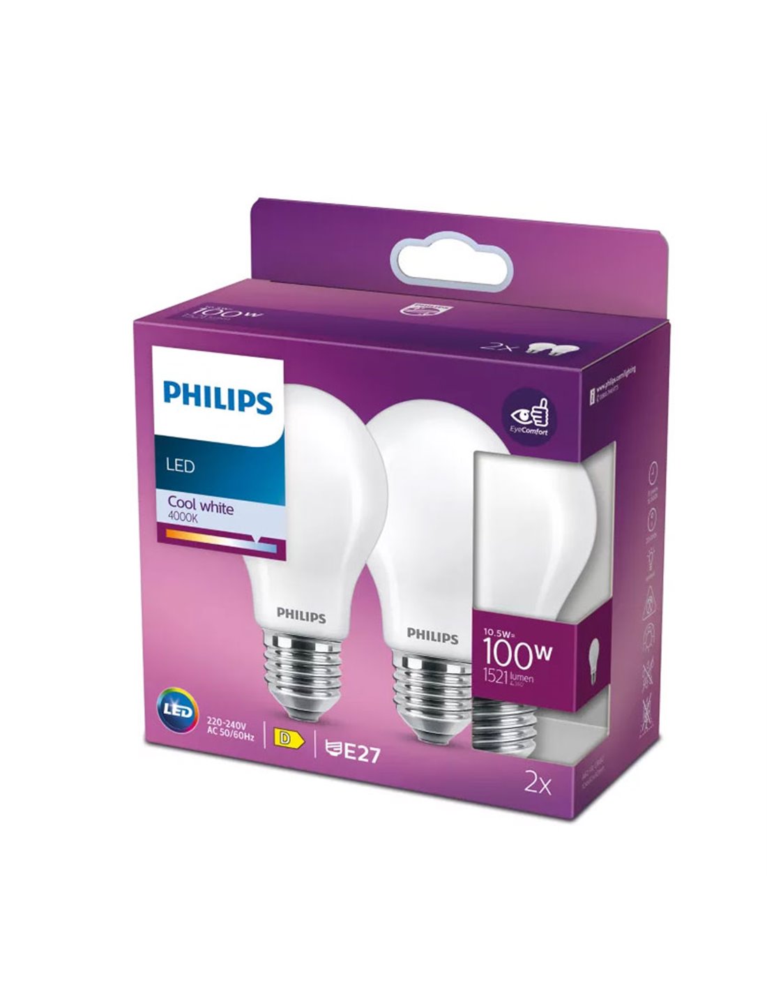 Pacote com 2 lâmpadas LED Philips A60 com encaixe E27 e potência de 10,5 W (equivalente a 100 W ). Estas lâmpadas de vidro opaco oferecem 1521 lm de luz branca fria homogênea de 4000 K , com EyeComfort e acendimento instantâneo . Não regulável , classe energética D (EPREL 387432 , 11 kWh/1000 h). Medidas por lâmpada: Ø60 × 104 mm (A60). Ideal para cozinhas , banheiros , áreas de estudo ou trabalho onde se exige luz clara e funcional, com a eficiência e a confiabilidade da Philips LED Classic .