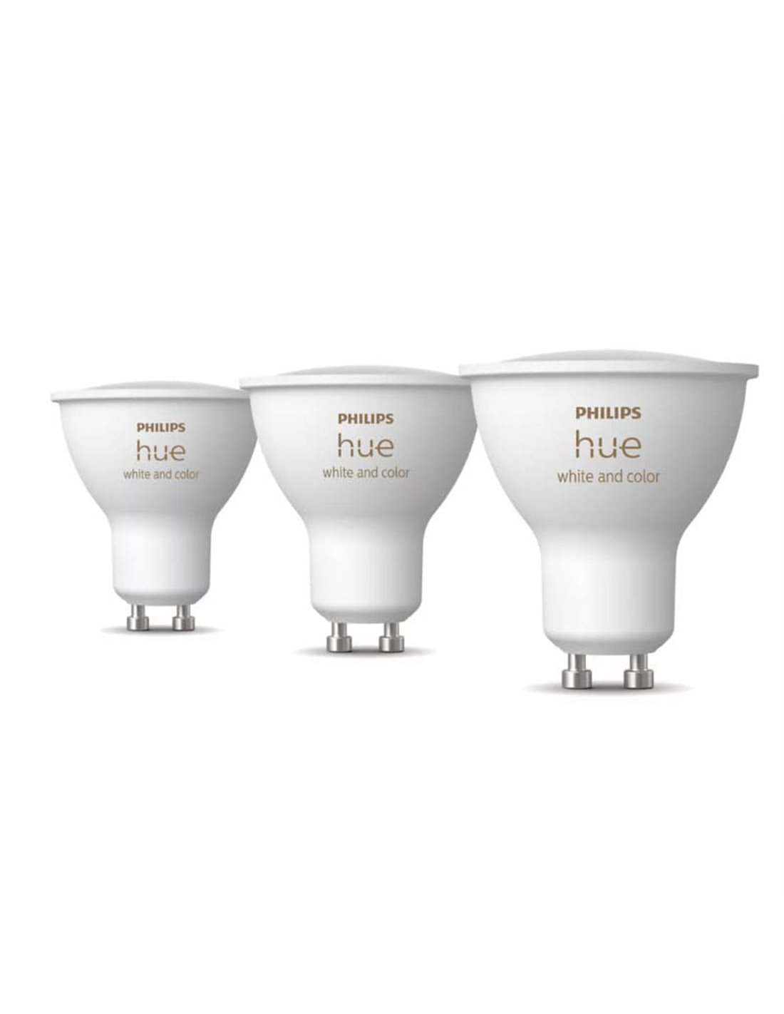 O Pack de 3 Lâmpadas Inteligentes LED Philips Hue White e Color Ambiance GU10 é a solução perfeita para quem procura uma iluminação totalmente personalizável. Estas lâmpadas oferecem milhões de cores e tons de luz branca que se adaptam a qualquer momento ou necessidade. Controle e transforme o seu espaço com facilidade graças à sua compatibilidade com Bluetooth e Zigbee.