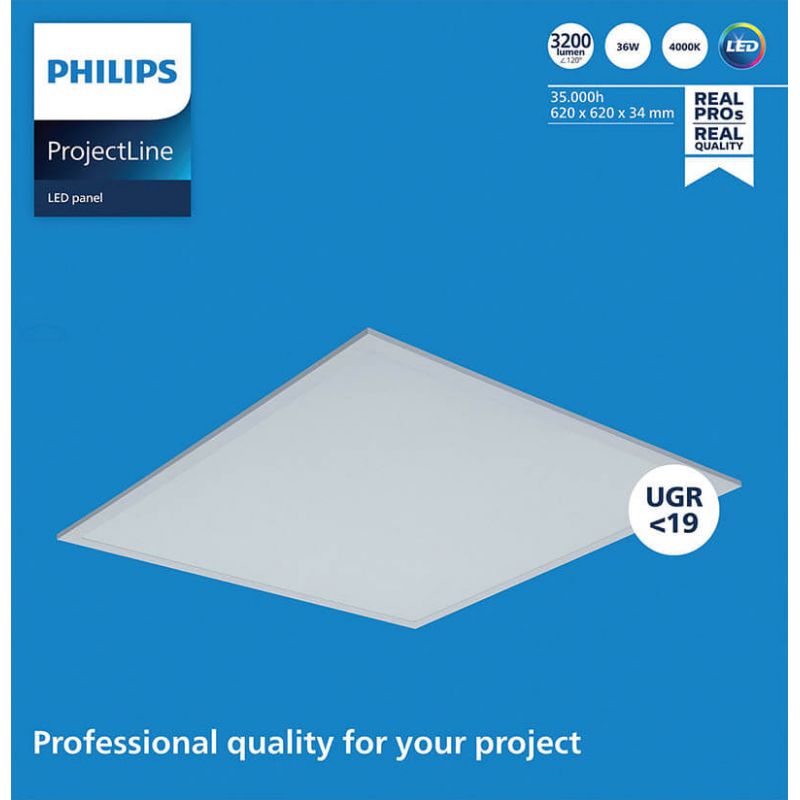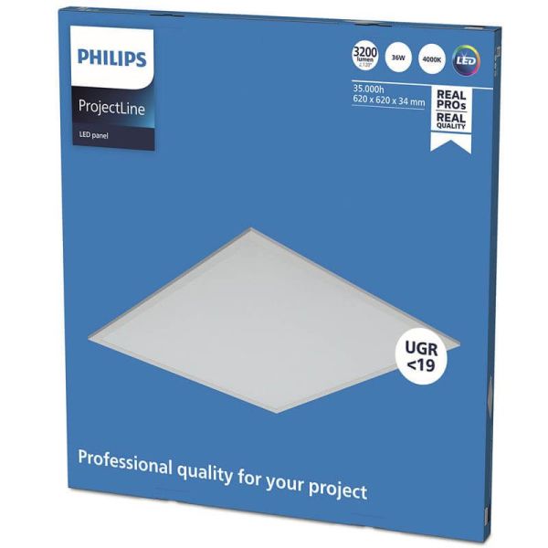 Se procura um Painel LED 62X62Cm com UGR19, este Painel ProjectLine da Philips consome apenas 36W e a sua intensidade luminosa é de 3.200Lm, equivalente a mais de 220W dos antigos. A duração deste Painel é superior a 35.000 Horas e a garantia oferecida pela Philips é de 3 anos.