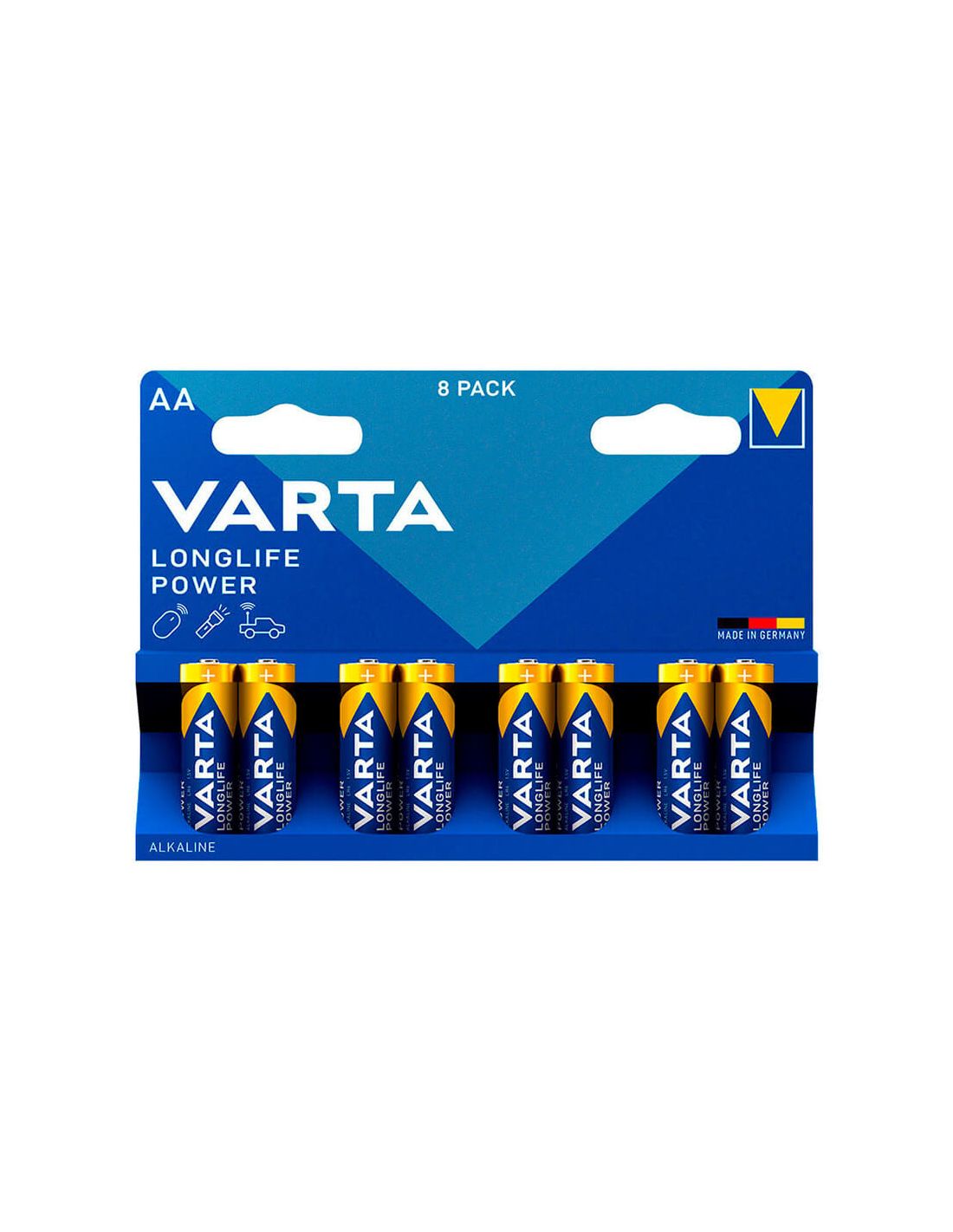 Pacote com 8 pilhas alcalinas VARTA Longlife Power AA (LR06) com voltagem de 1,5 V, projetadas para oferecer energia estável e longa vida útil em dispositivos de alto consumo, como brinquedos, lanternas e câmeras.