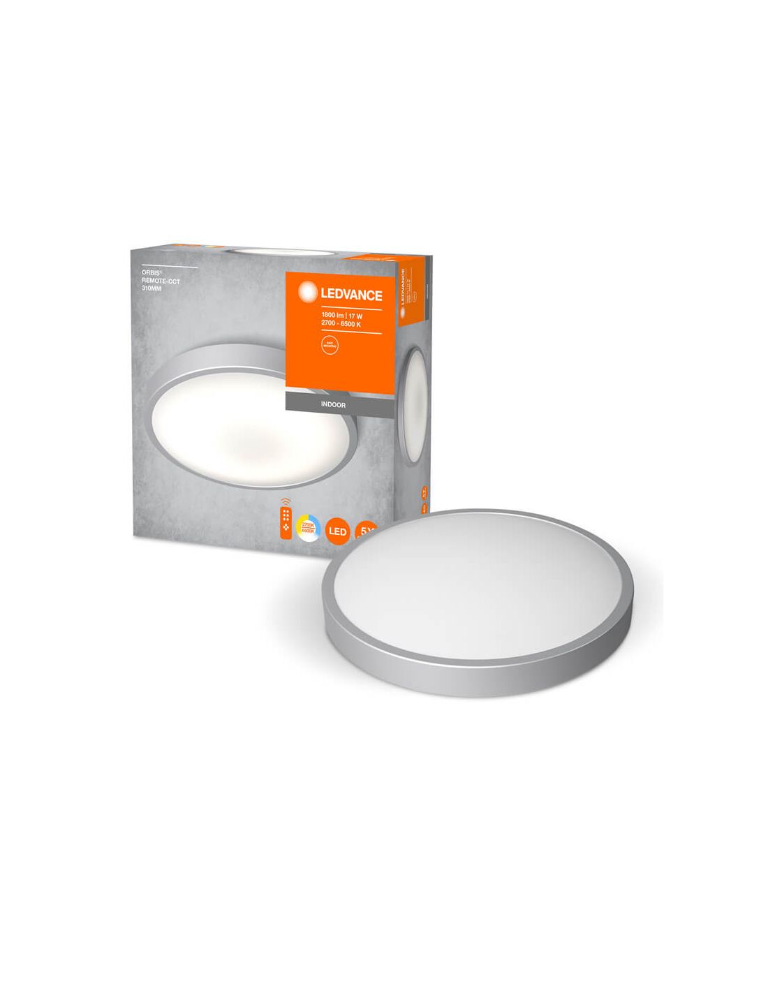 Se procura um plafon LED moderno , de cor prateada e com um design moderno que permite regular a nova gama de luminárias LedVance, o Orbis CCT Click é a melhor opção, não ofusca e oferece 5 anos garantia.