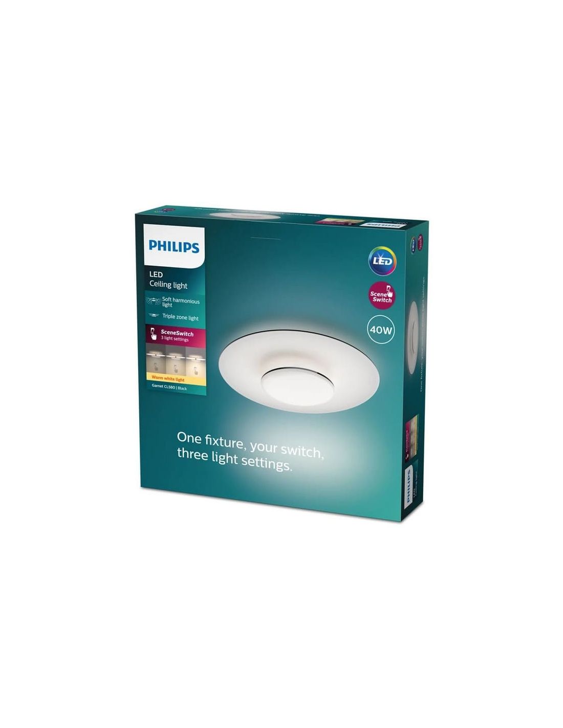 Experimente a excelência em iluminação com o Plafon LED Preto e Branco GARNET Ø50cm da Philips. Equipado com a tecnologia SceneSwitch, este plafon permite ajustar a temperatura da cor da luz de acordo com as suas necessidades, oferecendo uma luz quente de 2700K que cria um ambiente acolhedor e confortável em qualquer espaço da sua casa.