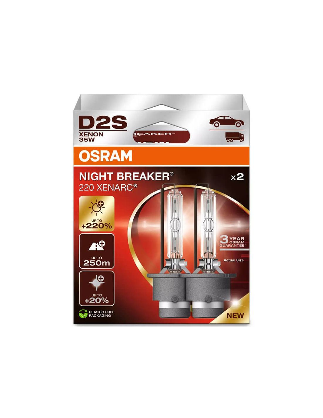 Novo Pack de 2 Lâmpadas Xénon D2S (P32d-2) da marca Osram, modelo Night Breaker 220 Xenarc , é uma lâmpada perfeita se procuramos até 220% mais intensidade luminosa e mais luz branca. Ele vem em uma caixa de papelão Plasticick Free. Luz 20% mais branca, mais de 220% de luminosidade e luz 20% mais branca.