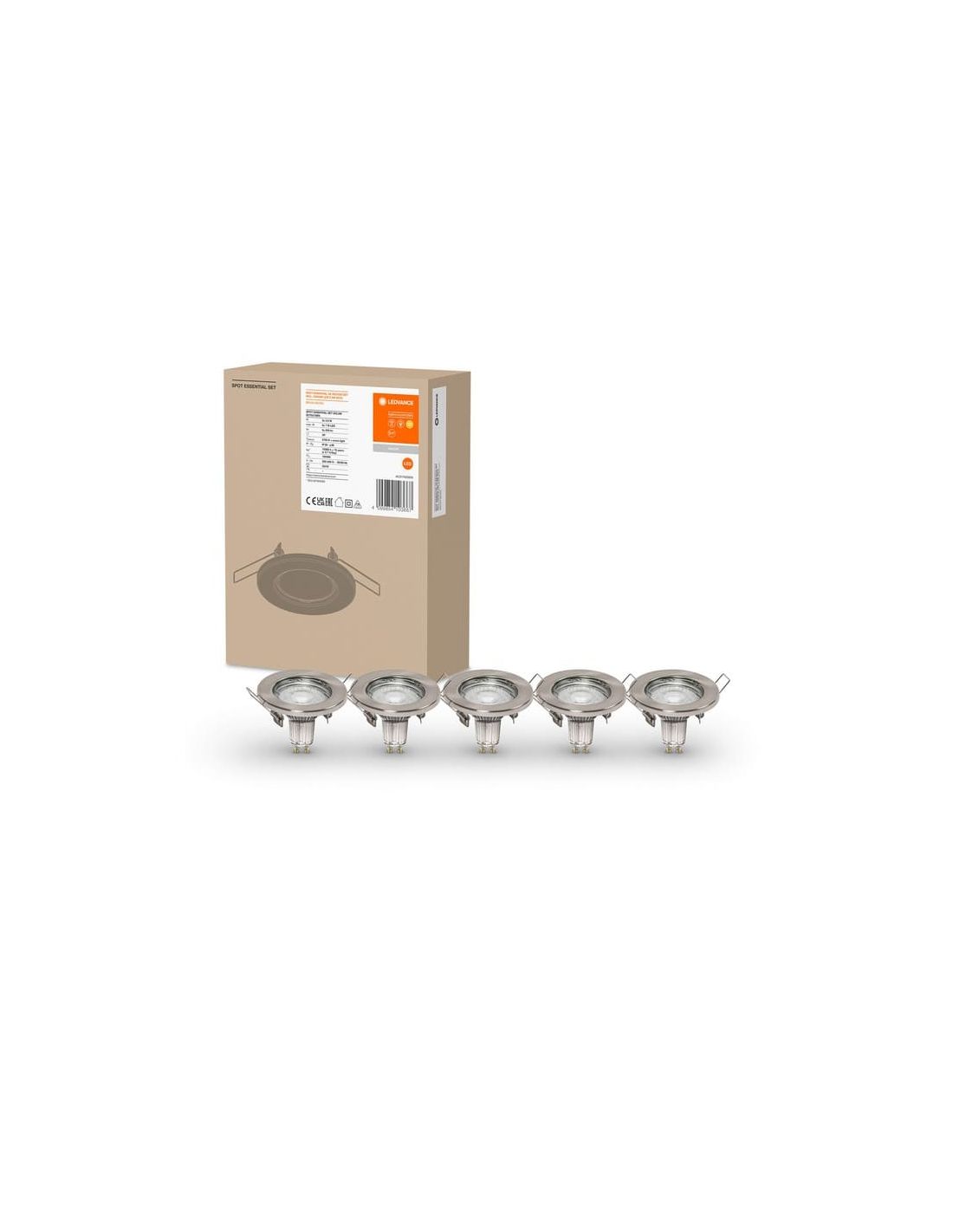 O conjunto de 5 focos da gama SPOT ESSENTIAL oferece iluminação quente de 2700K para interiores. Com tecnologia GU10 e design embutido, oferece uma solução versátil para criar ambientes aconchegantes. Perfeito para instalação em tetos, proporciona visual moderno e fácil instalação.