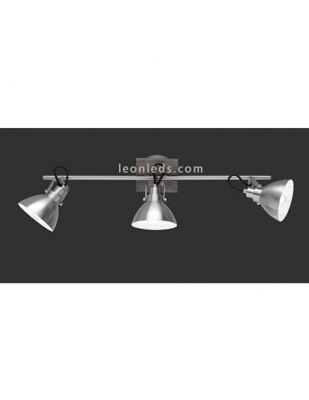 Tira 3 focos na cor Matt Nickel de estilo industrial da série Timber da Trio Lighting, necessita de 3 lâmpadas LED E14 (não incluídas), pode direcionar a luz para a área desejada e a sua instalação deve ser numa parede interior ou teto, a base da parede é de cor de madeira e o foco é de níquel antigo.