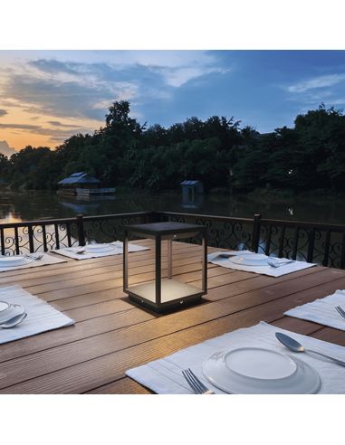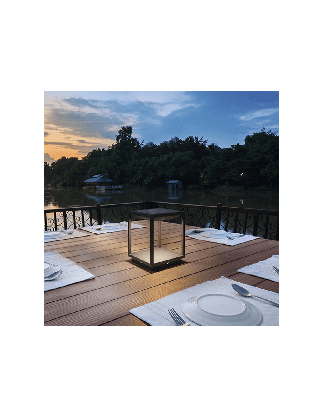 Farol Led solar de exterior da série SOLEI da Dopo , com potência de 3,5W projetando 300Lm de intensidade com uma cor clara de branco quente 3000K, ideal para iluminar uma mesa de exterior nas noites de verão.