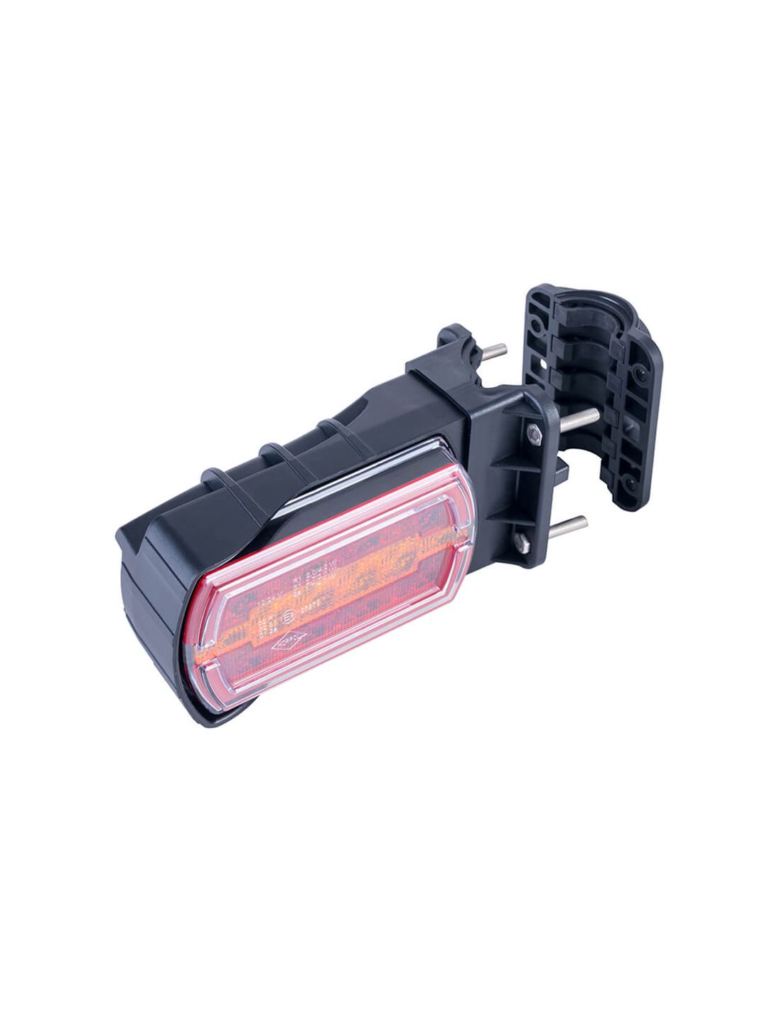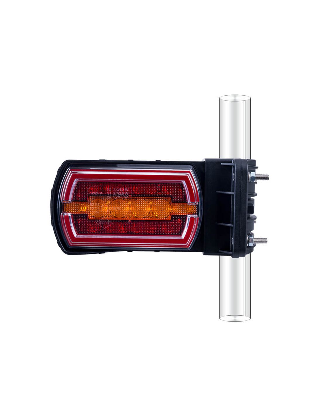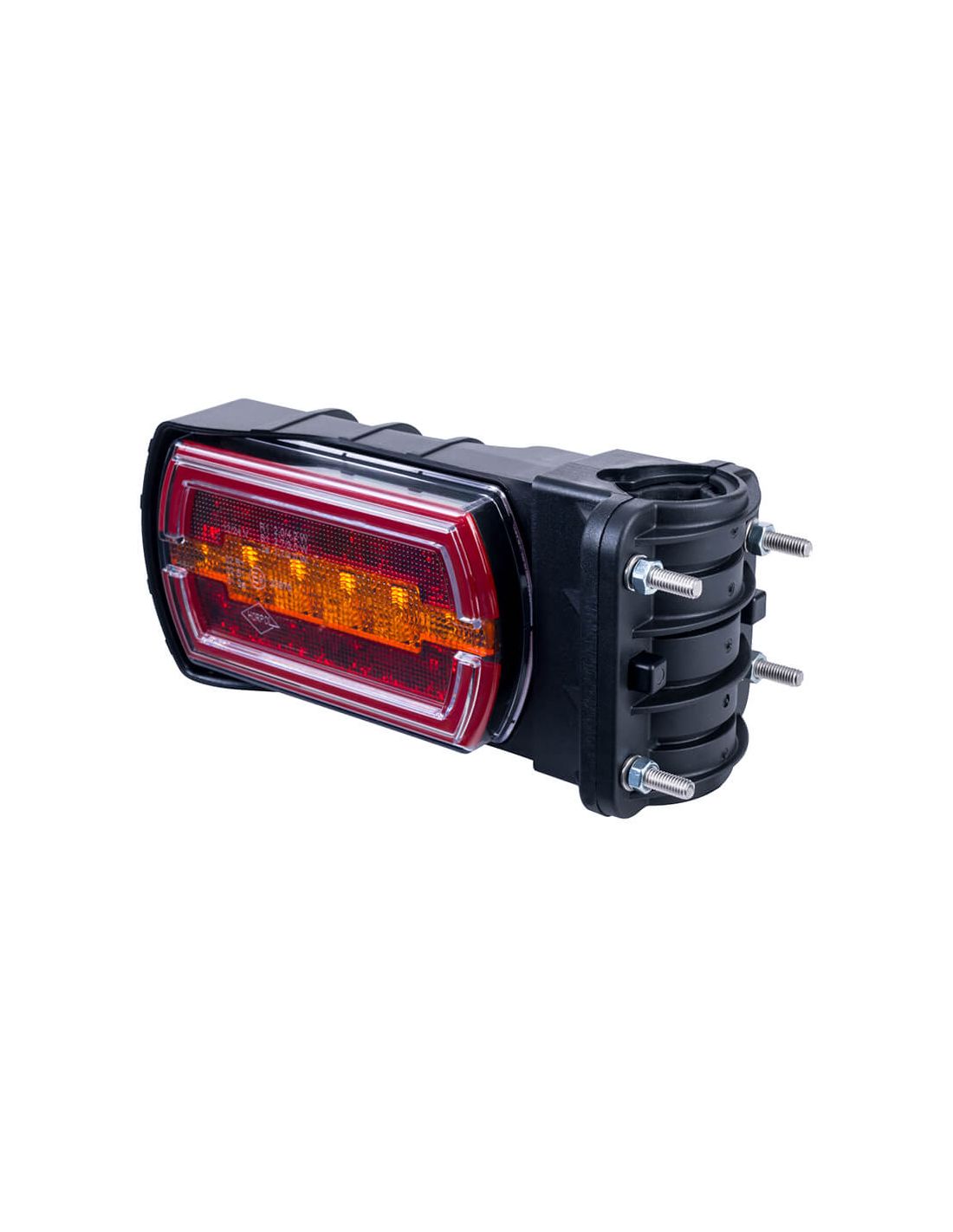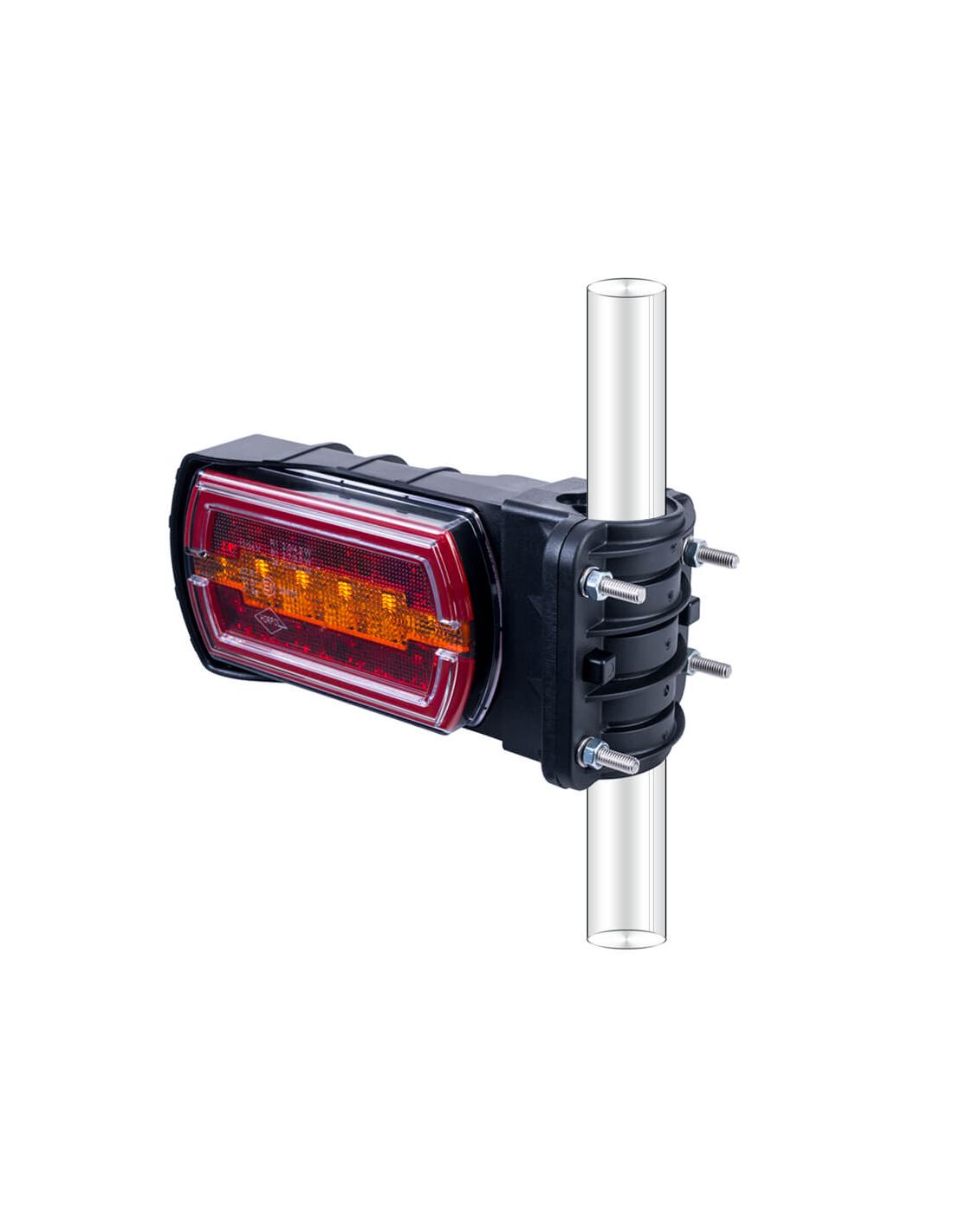 Lanterna traseira de LED CLEO LZD 2790/R2 com suporte para tubo de Ø20–30 mm, luzes de posição, freio e indicadores de direção NEON. Adequado para 12/24 V, IP68, uso universal em veículos e máquinas. Adequado para 12/24 V e uso universal. Este modelo é totalmente submersível e possui os códigos de aprovação R1, S1 e 2A. Não possui alça; pode ser instalado tanto no lado esquerdo quanto no direito com instalação lateral.