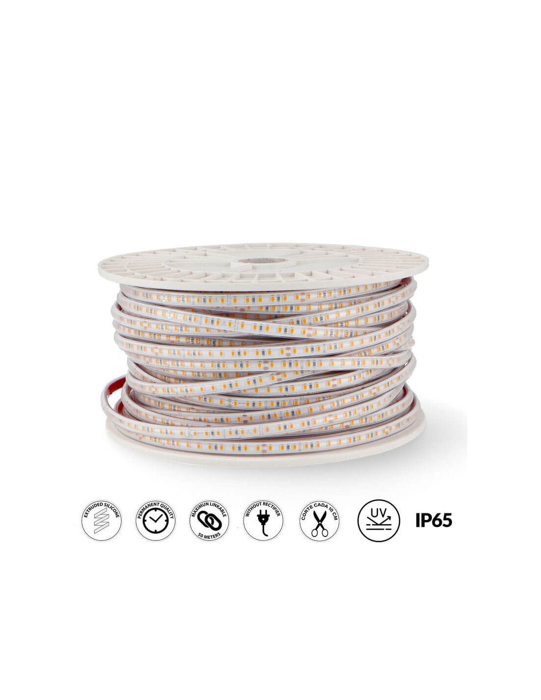 Fita de LED PROSTRIP SMD2835 de 12 W/m , com conexão direta a 220 V CA, com capacidade de conexão de até 50 metros , IP65 e CRI90 . Disponível em 2100 K, 2700 K, 4000 K e 6000 K , com dimerização TRIAC , dimerização de 10 cm e proteção externa . Ideal para iluminação profissional interna e externa.