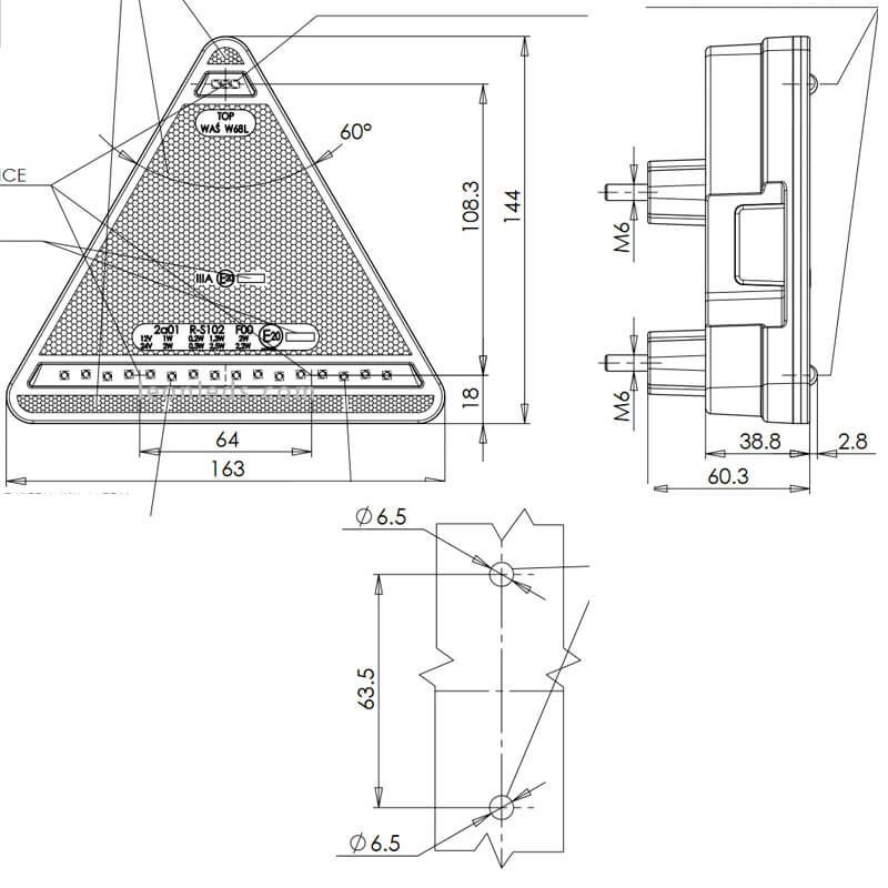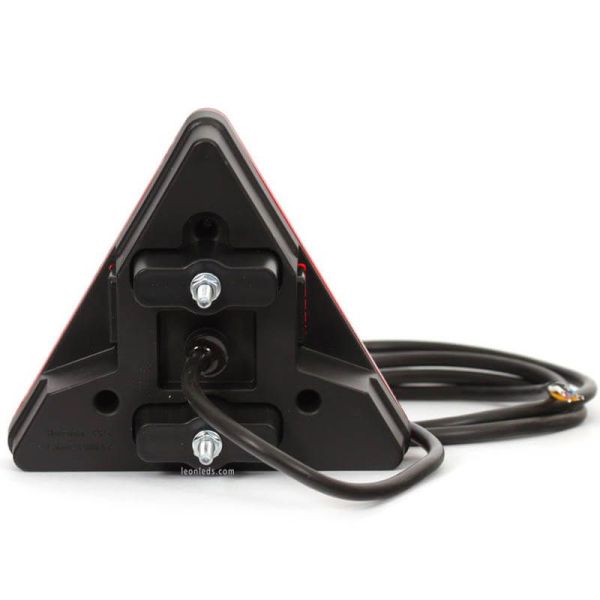 LED Traseiro Triângulo válido para instalações 12 volts e 24 volts com 6 Funções , inclui 185Cm de cabo, pode ser instalado sem os suportes que ofereceriam uma largura de apenas 4Cm ou através dos 2 suportes incluídos com 6,1Cm de largura.
