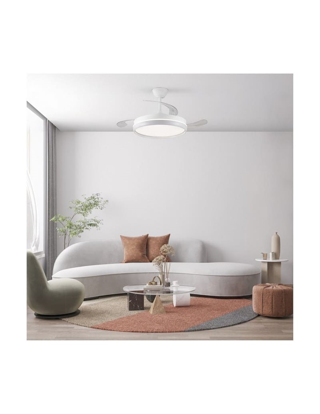 O ventilador de teto CHARLY EVO LED é uma solução de vanguarda que combina iluminação e ventilação eficientes em um design elegante com pás retráteis . Essas pás são acionadas quando o ventilador é ligado e retraem quando ele é desligado, oferecendo uma estética limpa e moderna.