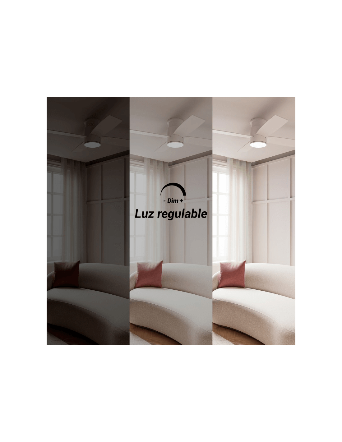 O Ventilador Taro , com um design moderno em branco brilhante com quatro pás reversíveis em branco e madeira clara, é ideal para divisões entre os 13 e os 20m2 como cozinhas, salas, quartos , etc.