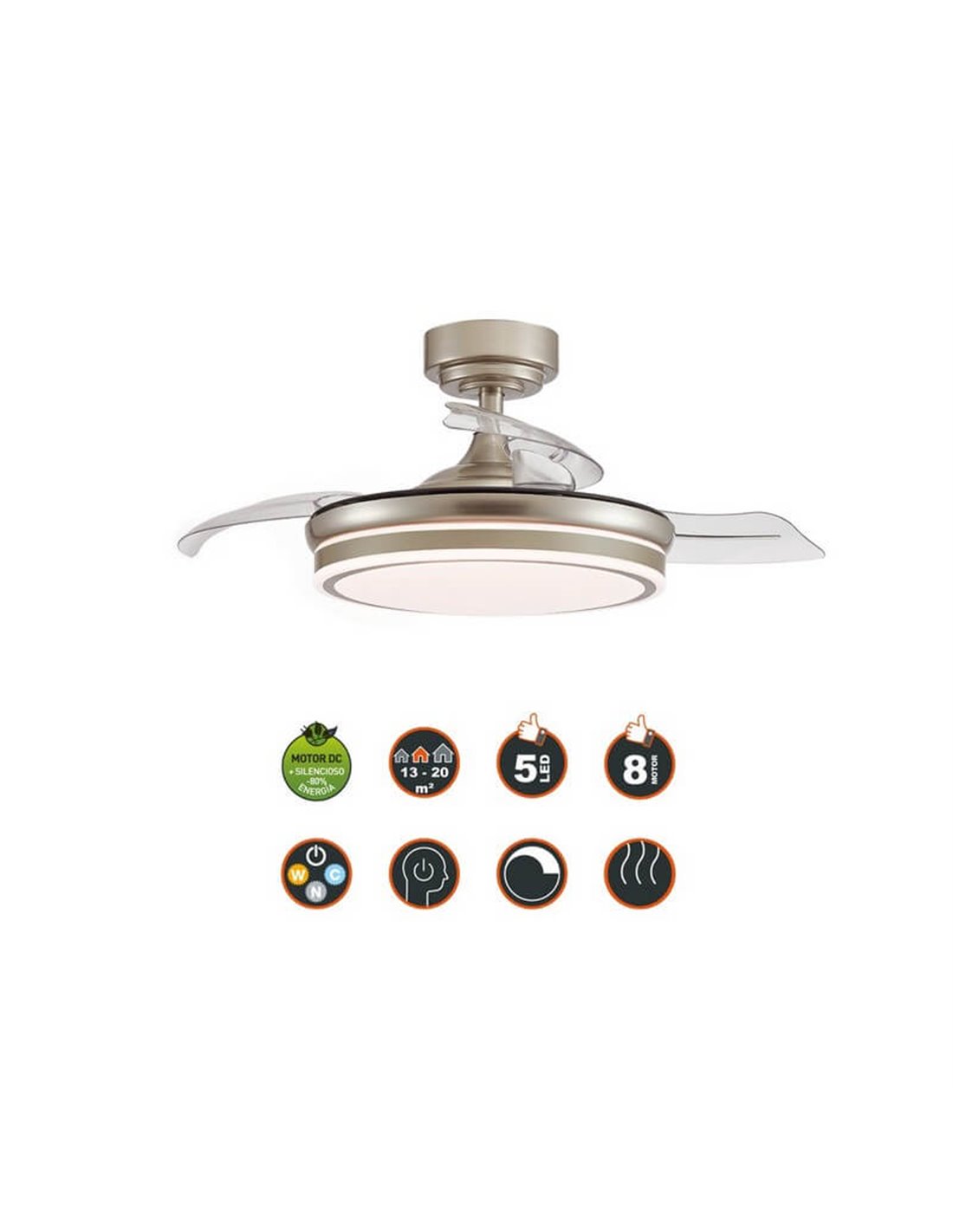 Ventoinha de teto LED Mini Moss para ambientes pequenos . Ventilador de teto com pás retráteis projetado para proporcionar fluxo de ar e iluminação em quartos e pequenas salas. Possui motor ultrassilencioso de 6 velocidades, função reversa inverno-verão, temporizador e função brisa. Quanto à iluminação, você pode definir três tons de iluminação (quente, neutro ou frio) e diminuir a intensidade luminosa. O corpo do ventilador é de cor níquel e as pás dobráveis são transparentes.