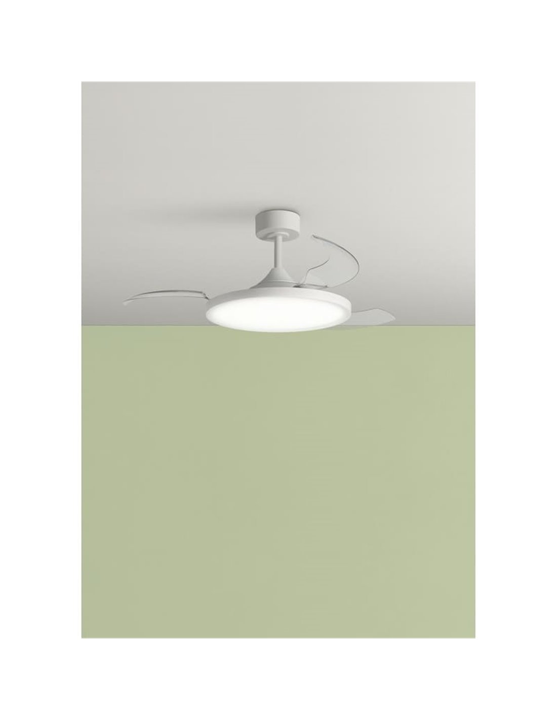O ventilador CORFU branco de 107 cm de diâmetro da MDC combina um design moderno e funcional com os recursos mais eficientes do mercado. Graças ao seu sistema de pás dobráveis , o ventilador se transforma visualmente quando desligado, mantendo uma aparência limpa e discreta no teto.