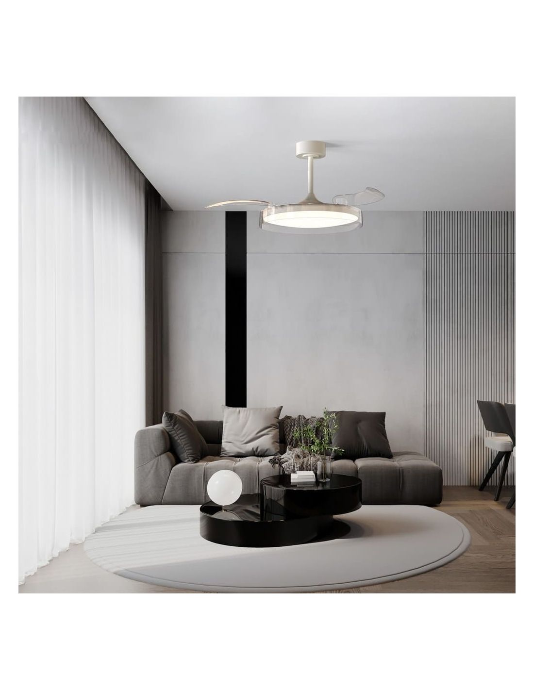 Graças às suas pás transparentes , este ventoinha é percebido como um elemento discreto, ideal para salas de estar amplas, quartos ou espaços onde o design é uma prioridade.