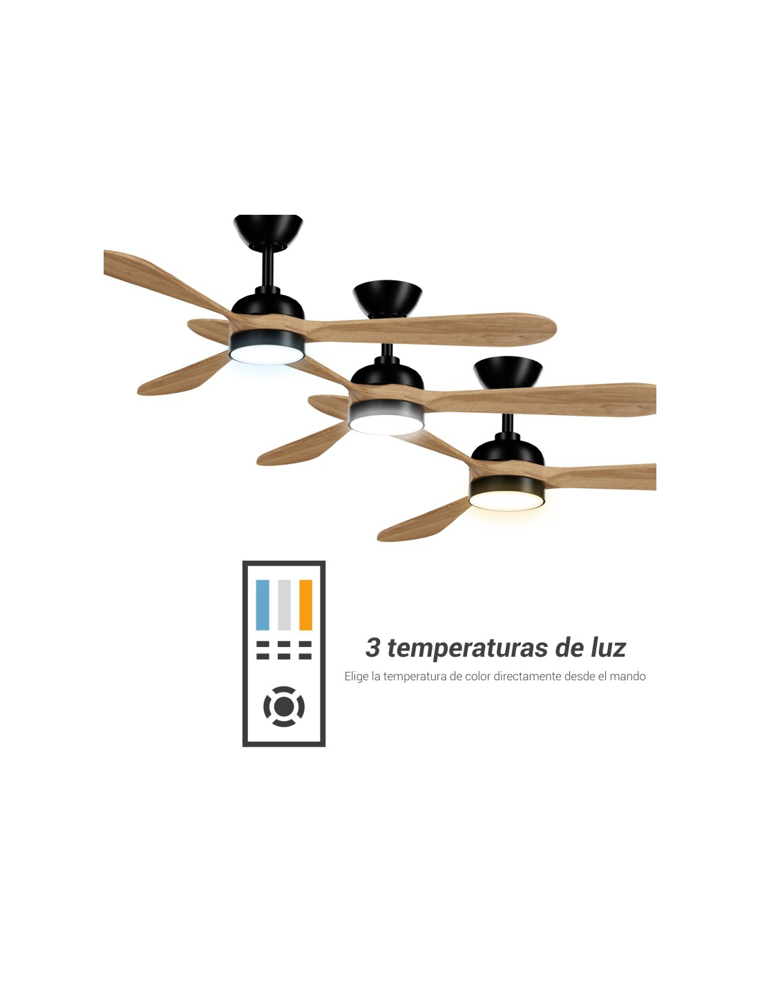 Entre as características do ventilador Tonda em preto e madeira, destacamos a função verão-inverno em que no verão as pás giram no sentido anti-horário e no inverno as pás giram no sentido horário. Além disso, possui um temporizador . Este dispositivo goza de 30.000 horas de vida.
