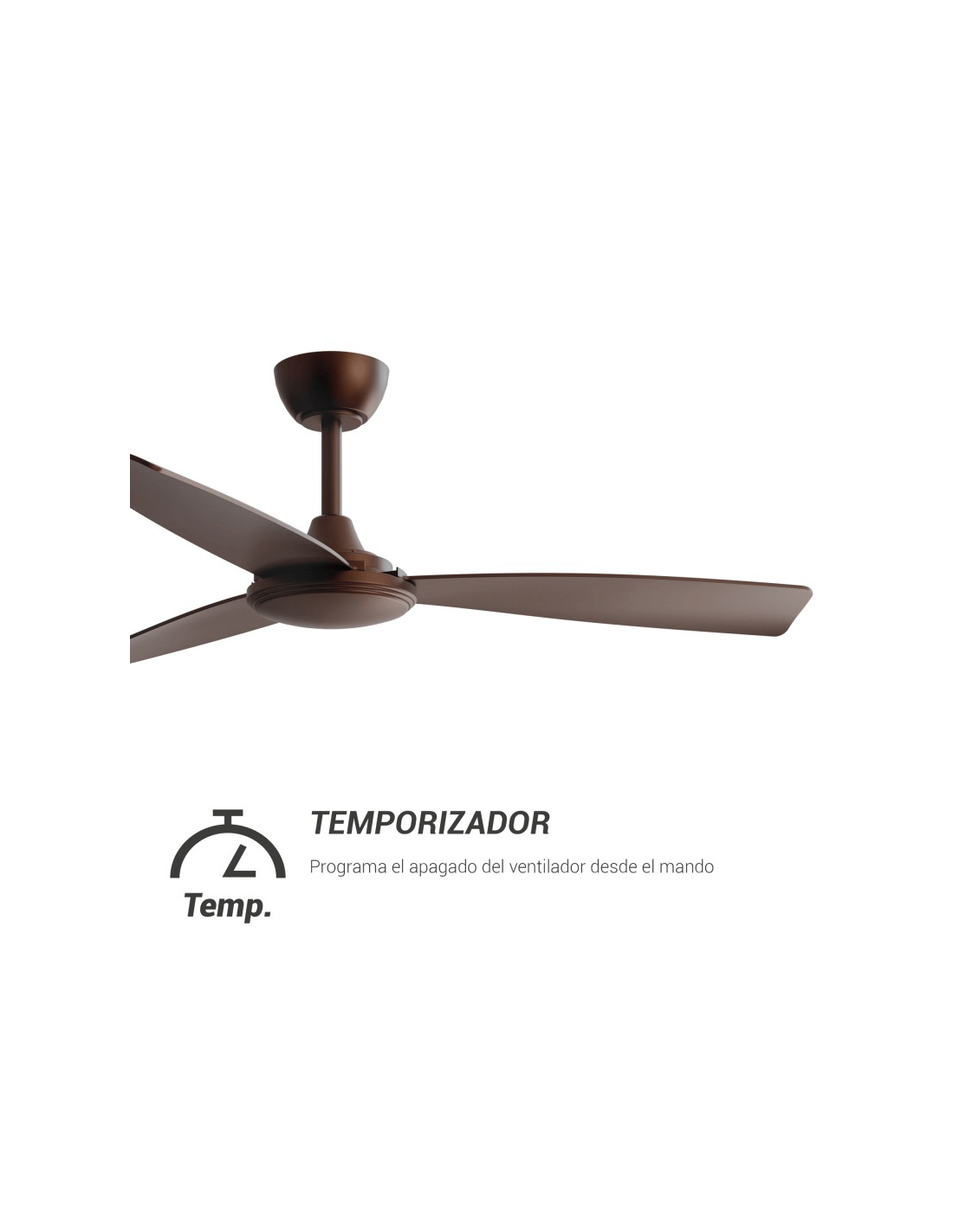 O ventilador de teto Lia marrom funciona em temperaturas entre -5ºC e 40ºC com um nível de ruído mínimo (máximo 43 dB na velocidade máxima) e resistência máxima graças à sua proteção IP20, perfeita para ambientes internos . Permite uma inclinação máxima do telhado de 15º.
