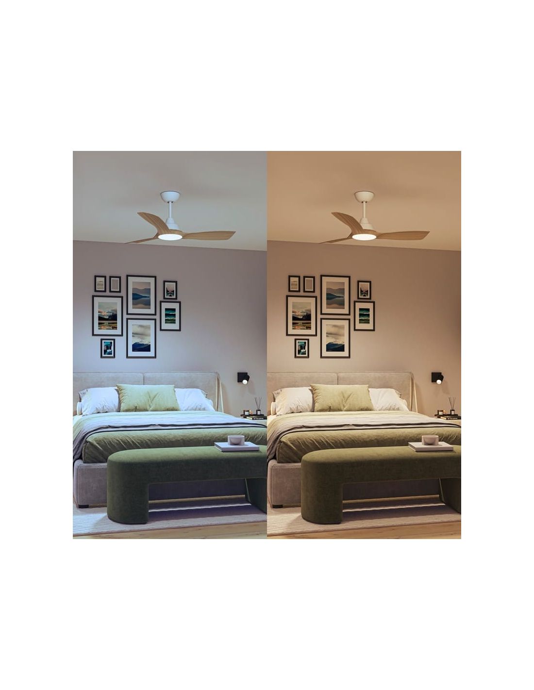O ventoinha de teto OLAS com acabamento em madeira branca e 132 cm de diâmetro é ideal para ambientes amplos. Possui LED integrado de 24W com 2650 lúmens e temperatura de cor ajustável de 3000K a 6500K .