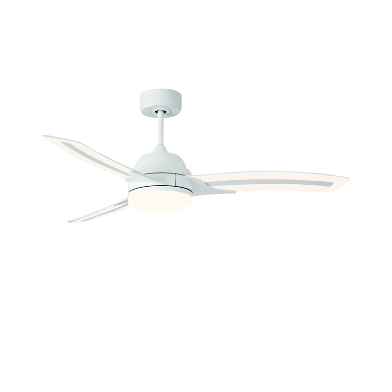Este modelo implementa uma distribuição de luz diferente, uma vez que estende a fonte de luz do ventilador às lâminas translúcidas, incorporando tiras de LED.