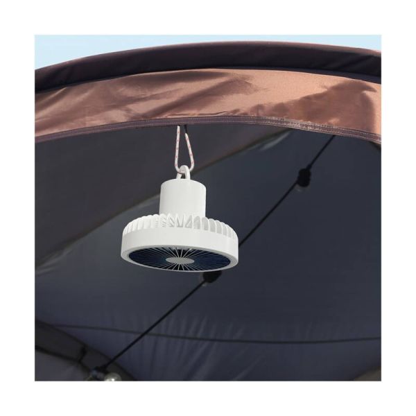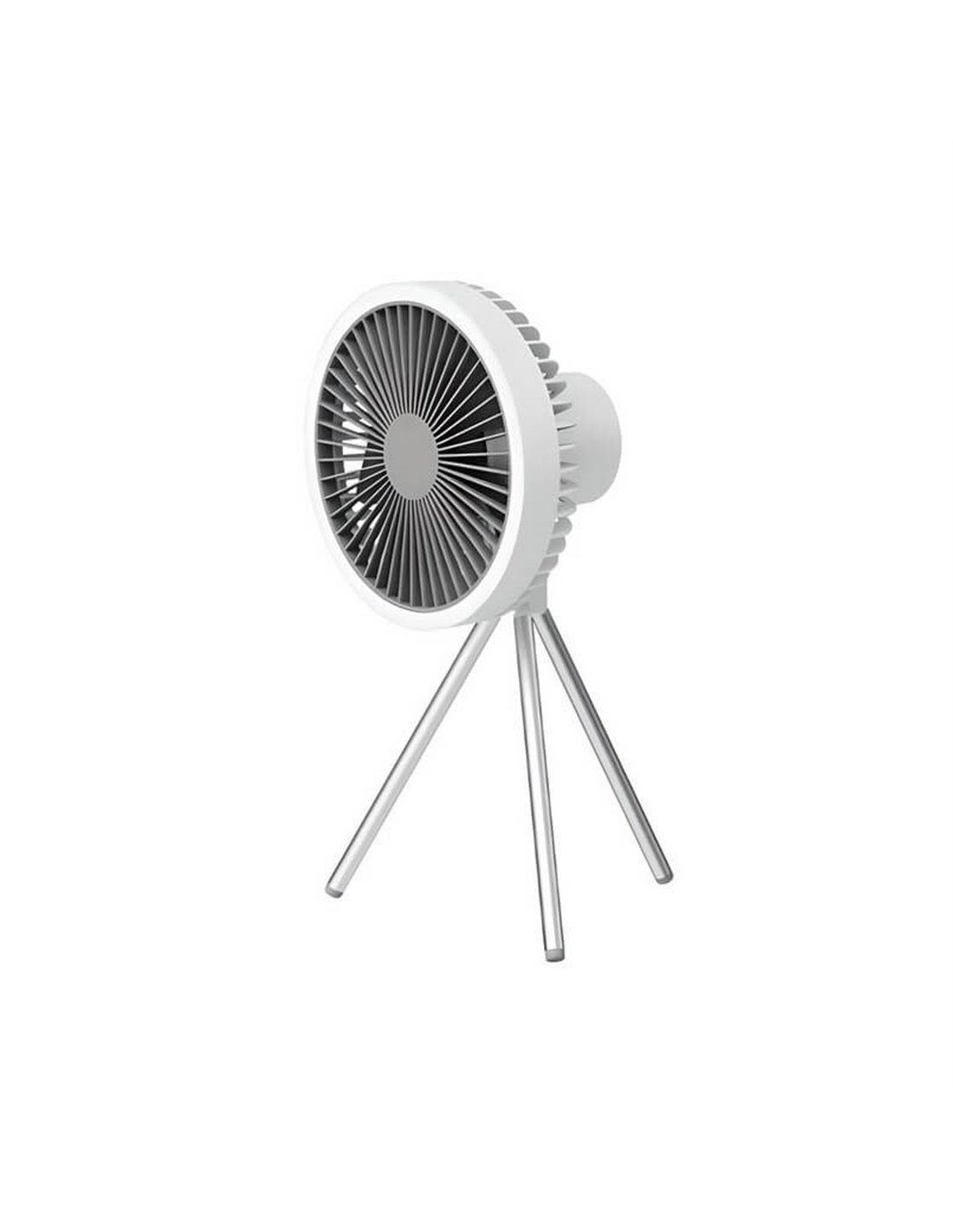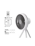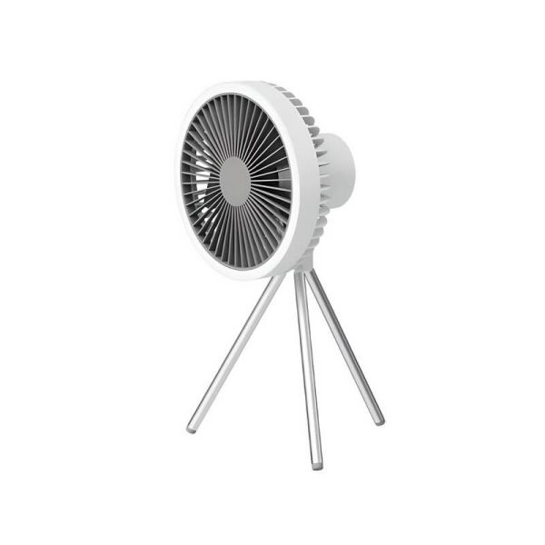 Este prático ventilador possui bateria recarregável via porta USB-C, permitindo seu uso sem a necessidade de cabos incômodos. A sua versatilidade permite colocá-lo sobre uma superfície como uma mesa ou chão com a estrutura de tripé incluída, ou pendurá-lo na parede ou no teto com um gancho.