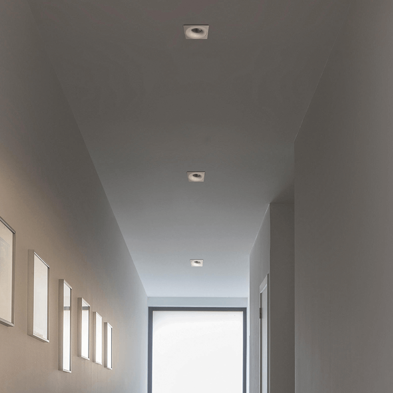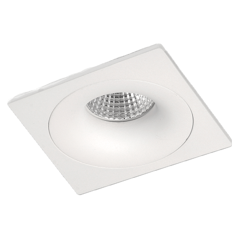 Trata-se de um foco de encastrar com estrutura em alumínio branco. Tem uma forma quadrada de 10 centímetros e 12 centímetros estão embutidos no interior.